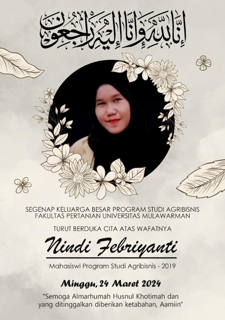 Innalillahi Wainailaihi Roji’un. Segenap Keluarga Besar Program Studi Agribisnis Fakultas Pertanian turut berduka atas meninggalnya Nindi Febriyanti Pada Hari : Minggu 24 Maret 2024. Semoga Allah Subhana Wataala memberikan tempat terbaik di sisiNya, diampuni segala dosanya dan dilapangkan jalannya. Aamiin.