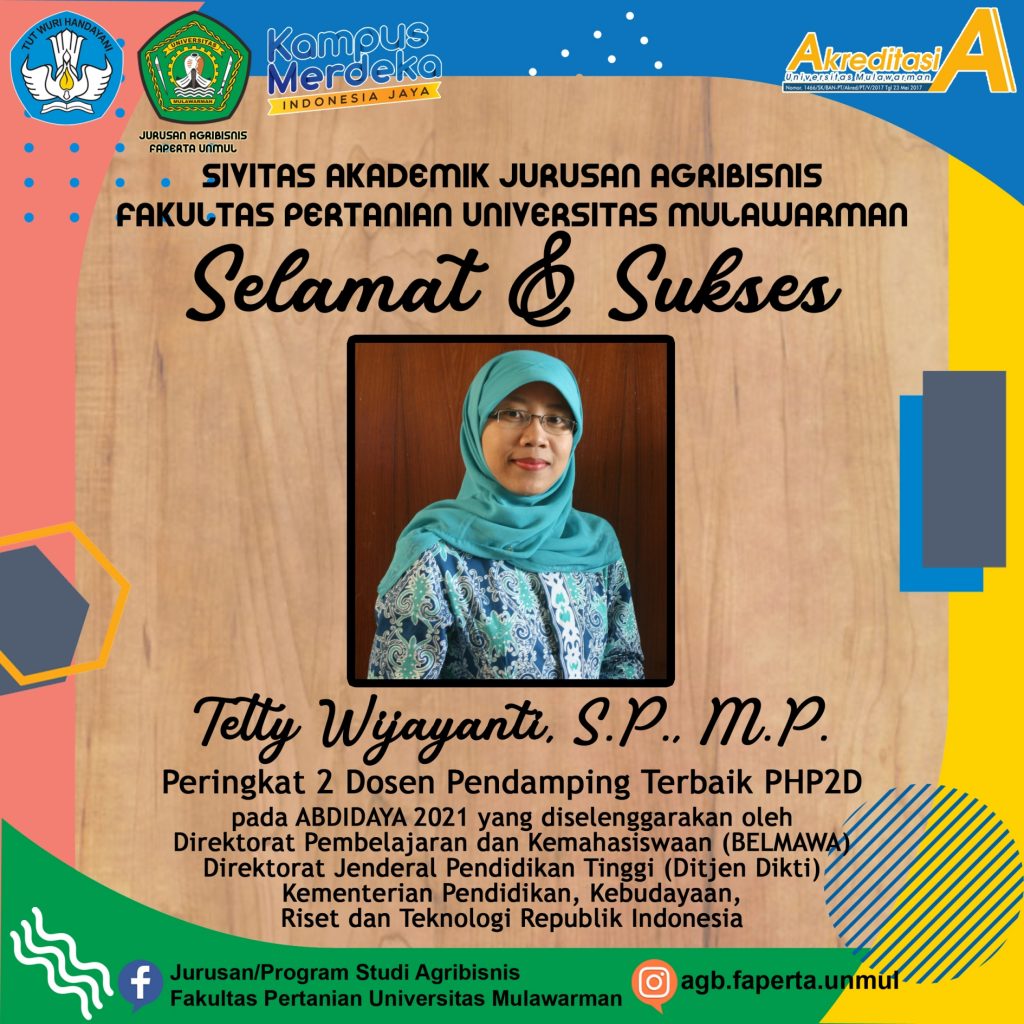 Jurusan Agribisnis bangga atas pencapaian yang diraih oleh salah satu dosen kita dalam Kegiatan ABDIDAYA 2021 yang diselenggarakan oleh Direktorat Pembelajaran dan Kemahasiswaan (BELMAWA) Direktorat Jenderal Pendidikan Tinggi (Ditjen Dikti) Kementerian Pendidikan, Kebudayaan, Riset dan Teknologi Republik Indonesia. Bu Tetty Read More …