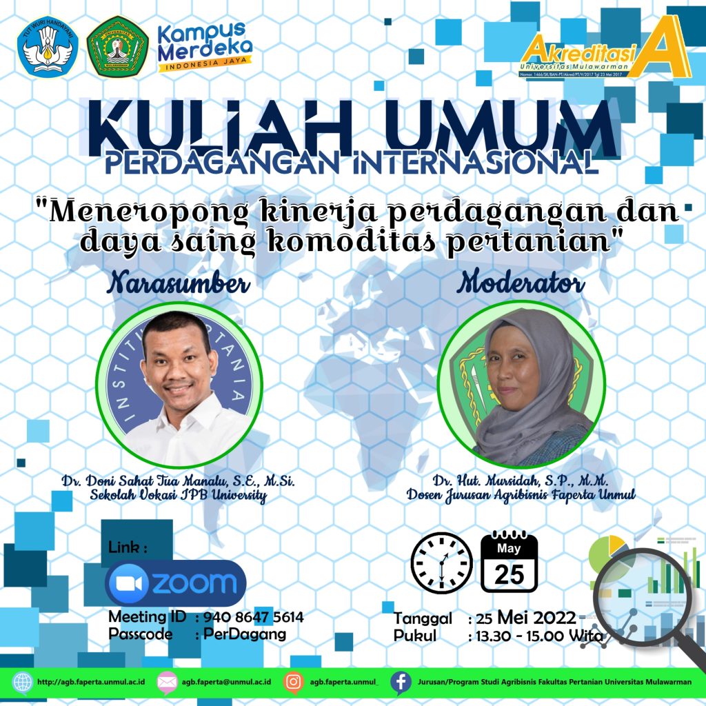 Kamis, 14 April 2022 telah dilaksanakan Kuliah Umum Perdagangan Internasional dengan tema “Meneropong Kinerja Perdagangan dan Daya Saing Komoditas Pertanian” dimana merupakan salah satu dari metode mengajar dengan menghadirkan narasumber dari luar kampus.Dalam kesempatan ini, Jurusan Agribisnis menghadirkan narasumber dari Read More …