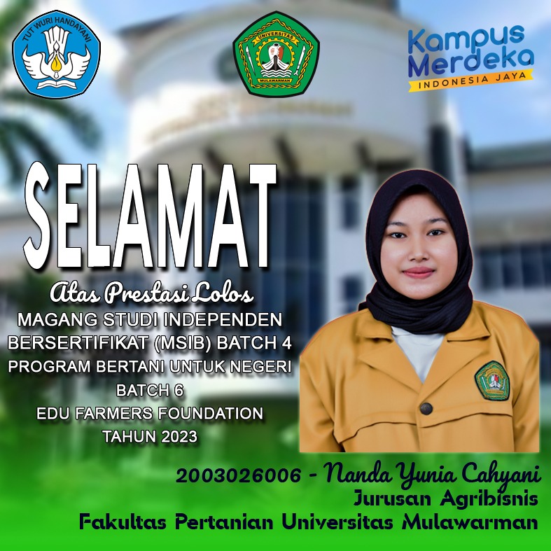 Seleksi MSIB Batch 4 Tahun 2023 telah berakhir. Selamat Kepada Nanda Yunia Cahyani dari Jurusan Agribisnis angkatan 2020 atas Prestasi Lolos pada Program Magang Studi Independen Bersertifikat (MSIB) Batch 4 Program Bertani untuk Negeri Batch 6 EDU Farmers Foundation Tahun Read More …